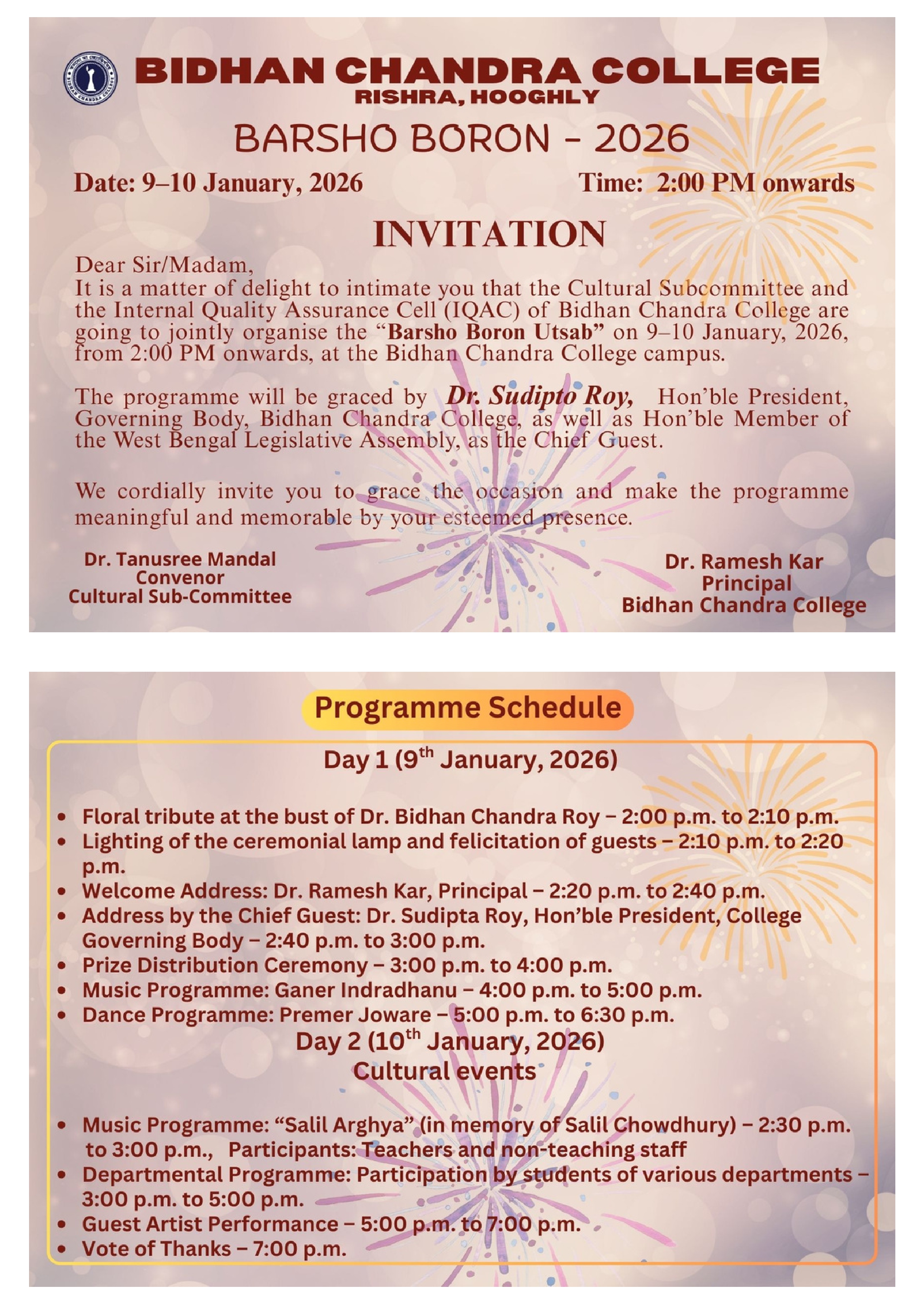 On behalf of the College it is truly a pleasurable privilege for me to address you all at the advent of a fresh academic session with sincere hearty blessings and best wishes. Obeying ever always the invaluable saying of Swami Vivekananda—“Passion, not pedigree will win in the end”, -we are on the verge of crossing the existing academic year successfully though with certain undulations. I welcome the forthcoming academic session with utmost earnestness and enthusiasm. According to retrospection, the most significant event of the outgoing session of the college is the crossing the bar of the assessment and accreditation made by National Assessment and Accreditation Council (NAAC), Bangalore, a UGC Affiliated agency. For the first time, our College in its rather long history of almost sixty years has been successfully accredited by NAAC and placed on a four point scale at ‘Grade – B’. We may feel proud to mention that behind this success the immense Endeavour, dedication and sacrifice made by each and every stakeholder (viz. the Governing Body, Staff members, Students, Alumni, Parents and Guardians etc.) of the college are, indeed, worthwhile. The assessment by the Peer Team took only three consecutive day of April’ 16, but to prepare every nook and corner of the College to face it, the concerned members have provided their untiring efforts like a team for more than a year. I, on behalf of the College, must not only congratulate them all, but pay my regard and gratitude to them for rendering their yeomen’s service to the College. The sudden departure of the Principal of the College elsewhere, prior to the couple of months of NAAC-visit, certainly created an undulated hiccup, but, thanks to the challenging but competent comrades of the college, the institute ultimately has fared well. In this connection, I may convey my indebtedness to all well-wishers, mentors and stake and heads of the neighboring colleges who unhesitatingly extended their hands of cooperation as and when requested.
